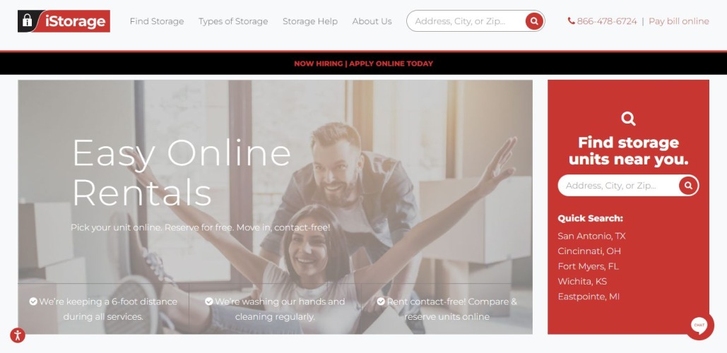 Types of storage that you get to choose from at iStorage include Self storage, Vehicle storage, Climate-controlled storage, and Commercial storage.
